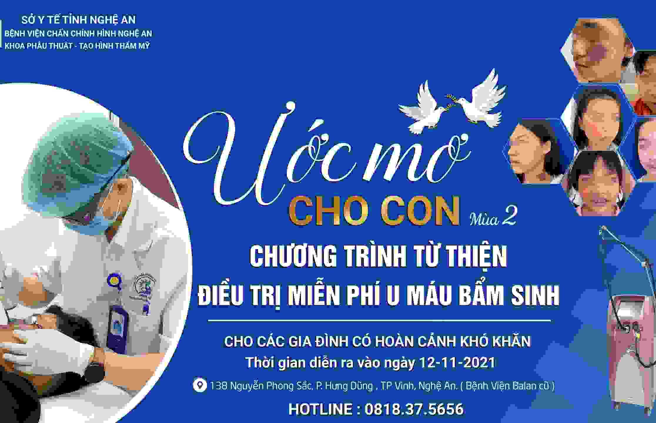 Với 170 trường hợp được điều trị u bớt máu bẩm sinh được điều trị thành công, miễn phí, chương trình “Ước mơ cho con” là món quà ý nghĩa dành tặng cho các trẻ em nghèo, kém may mắn; góp phần lan tỏa giá trị nhân văn sâu sắc. Tiếp nối thành công đó, ngày 12/11, Khoa phẫu thuật tạo hình thẩm mỹ - Bệnh viện Chấn thương chỉnh hình Nghệ An tiếp tục tổ chức chương trình thiện nguyện “Ước mơ cho con” mùa 2.
