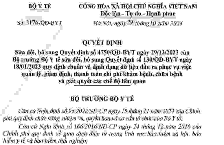 16. Quyết định số 3167/QĐ-BYT ngày 29/10/2024 sửa đổi, bổ sung Quyết định số 4750/QĐ-BYT ngày 29/12/2023 của Bộ Y tế sửa đổi, bổ sung Quyết định số 130/QĐ-BYT ngày 18/01/2023 Quy định chuẩn và định dạng dữ liệu đầu ra phục vụ việc quản lý, giám định, thanh toán chi phí khám bệnh, chữa bệnh và giải quyết chế độ liên quan (Có hiệu lực từ ngày 01/01/2025)