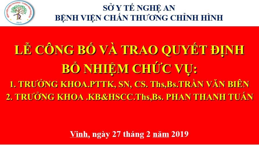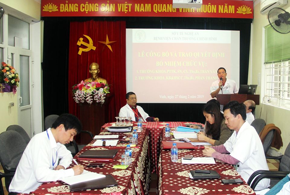 Sáng nay, ngày 27/02/2019, tại hội trường, Bệnh viện chấn thương chỉnh hình Nghệ An đã tổ chức Lễ công bố Quyết định bổ nhiệm 02 chức vụ lãnh đạo các khoa. Đến dự buổi lễ có sự hiện diện của các đồng chí trong Ban giám đốc, lãnh đạo các khoa, phòng trong toàn bệnh viện.
